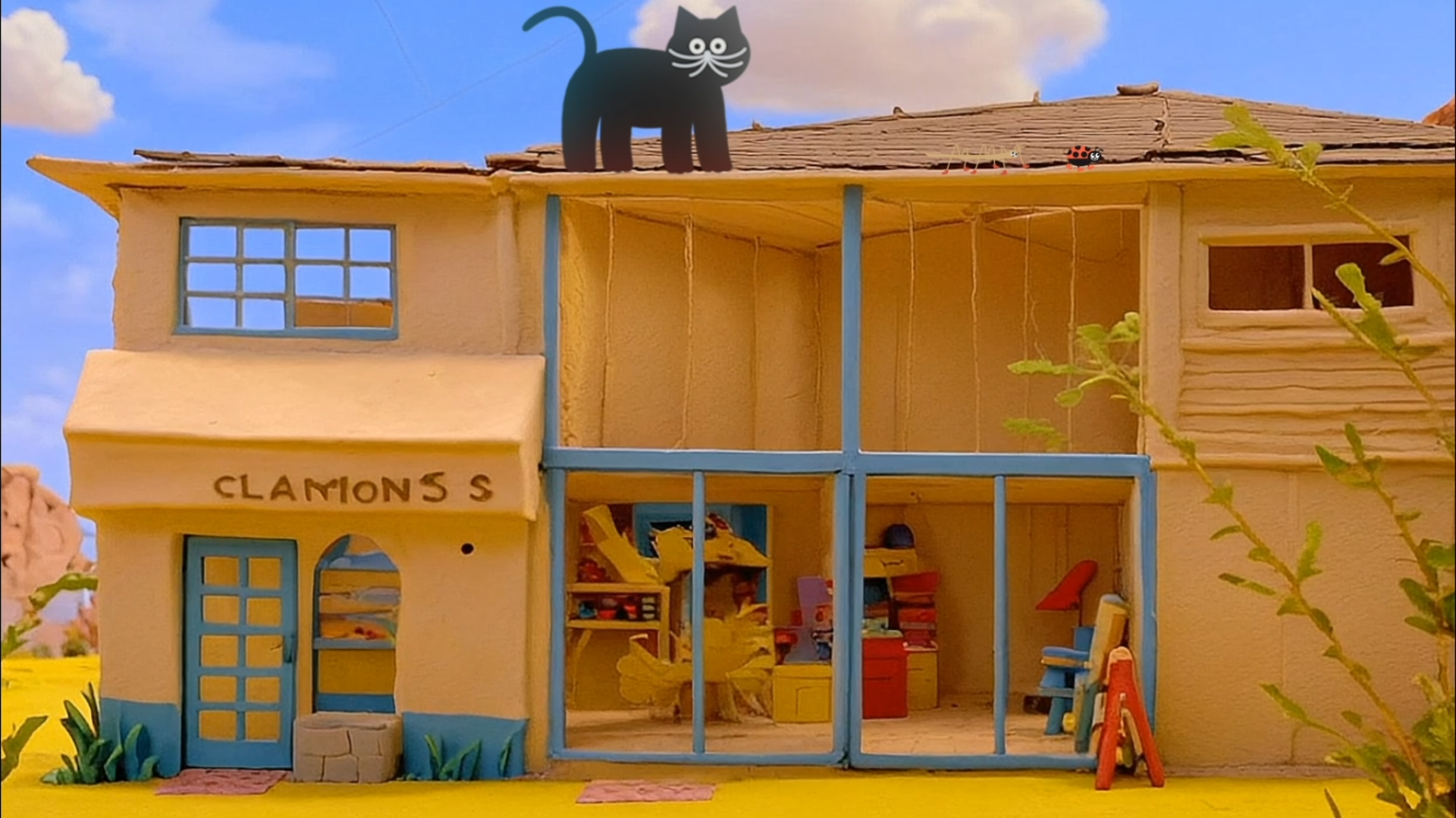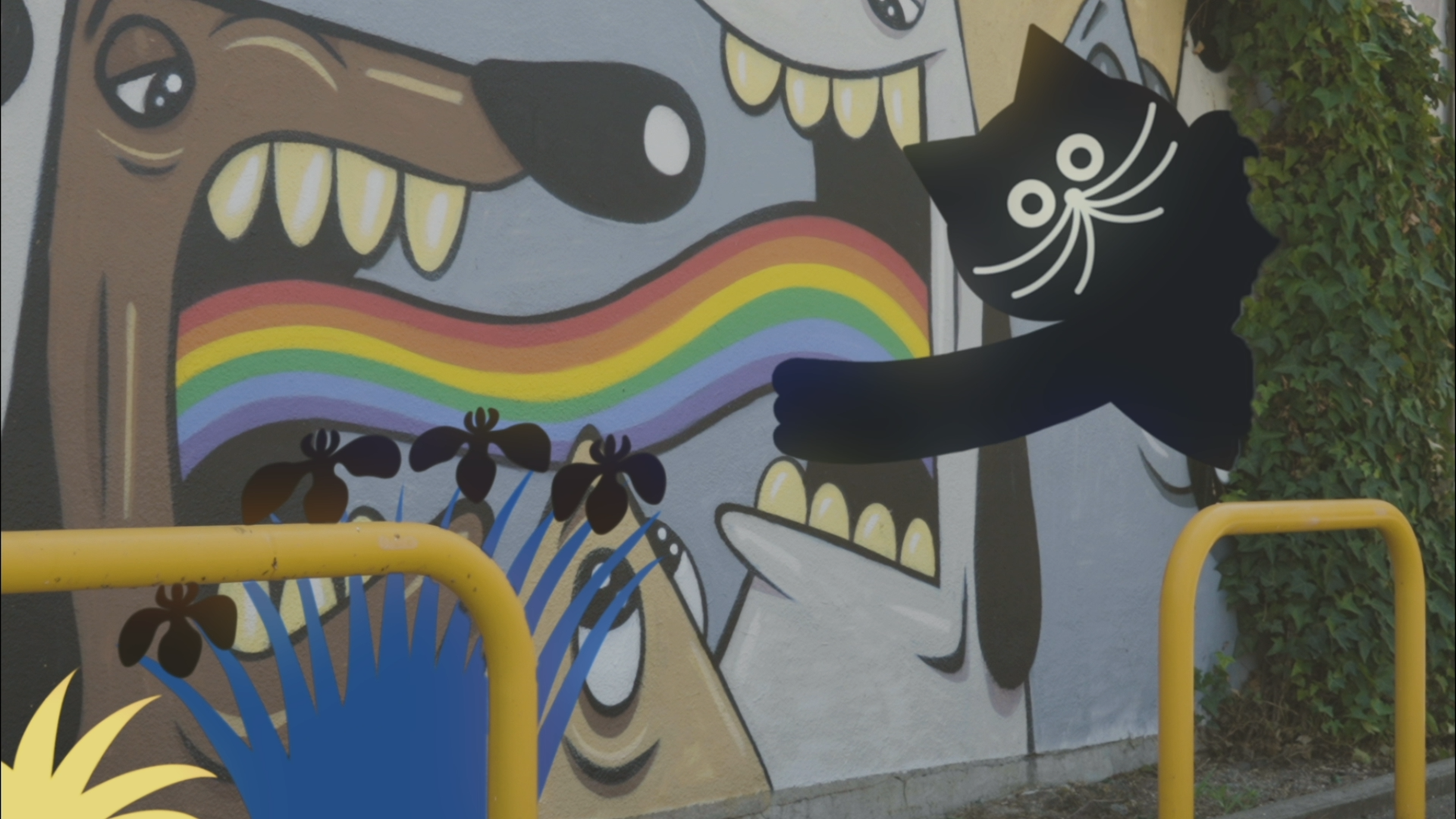 イラストレーター umao が北加賀屋に描いたウォールアートからネコが飛び出し、まちを案内するストーリー。